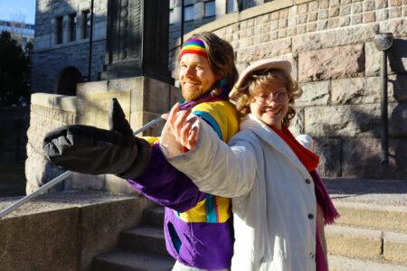 Eduskuntatalon portailla tänään Ilmastoisovanhemmat ry ja toinen pienempi ilmaston puolesta liputtava ryhmä.